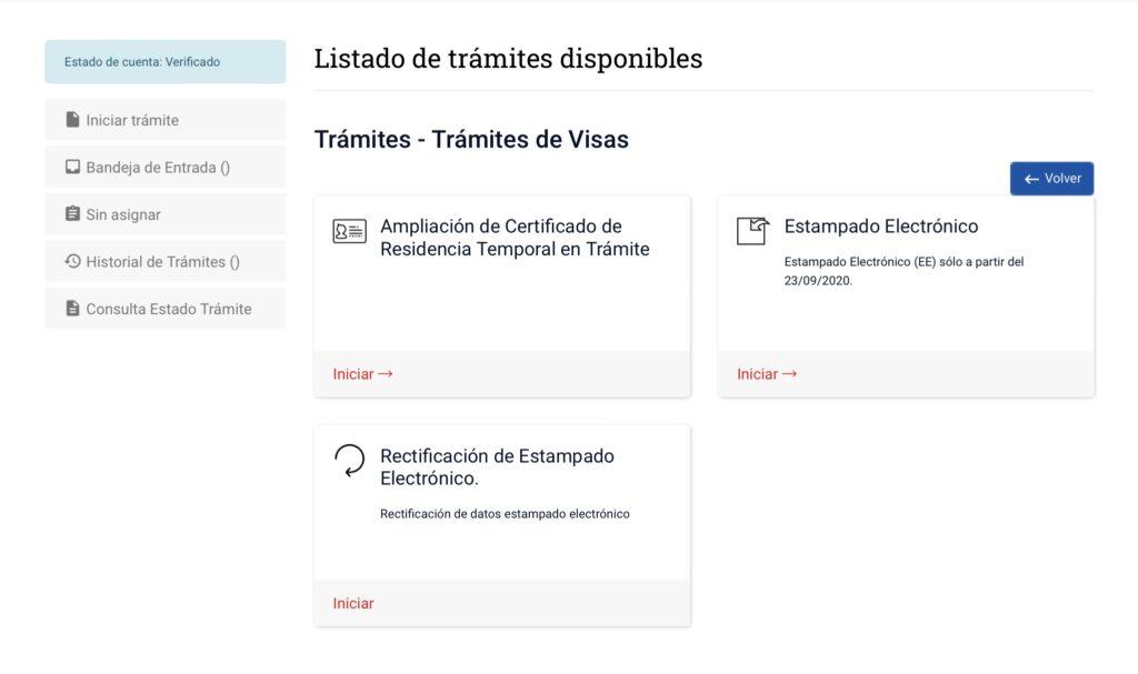 Al entrar con tu clave única o tu email, según te hayas registrado en la Web de Extranjería, verás en Trámites de Visa, estas tres opciones: