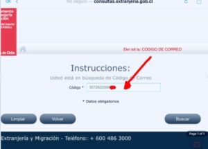 Reponn: Si ou voye aplikasyon, demann, viza Nan Extranjeria e w ta renmen konnen si tout bagay anfanm W dwe klyke LA e ekri kòd postal sa VLE di nimewo ki Nan Correos de Chile yo te bay w, example 4356457892345